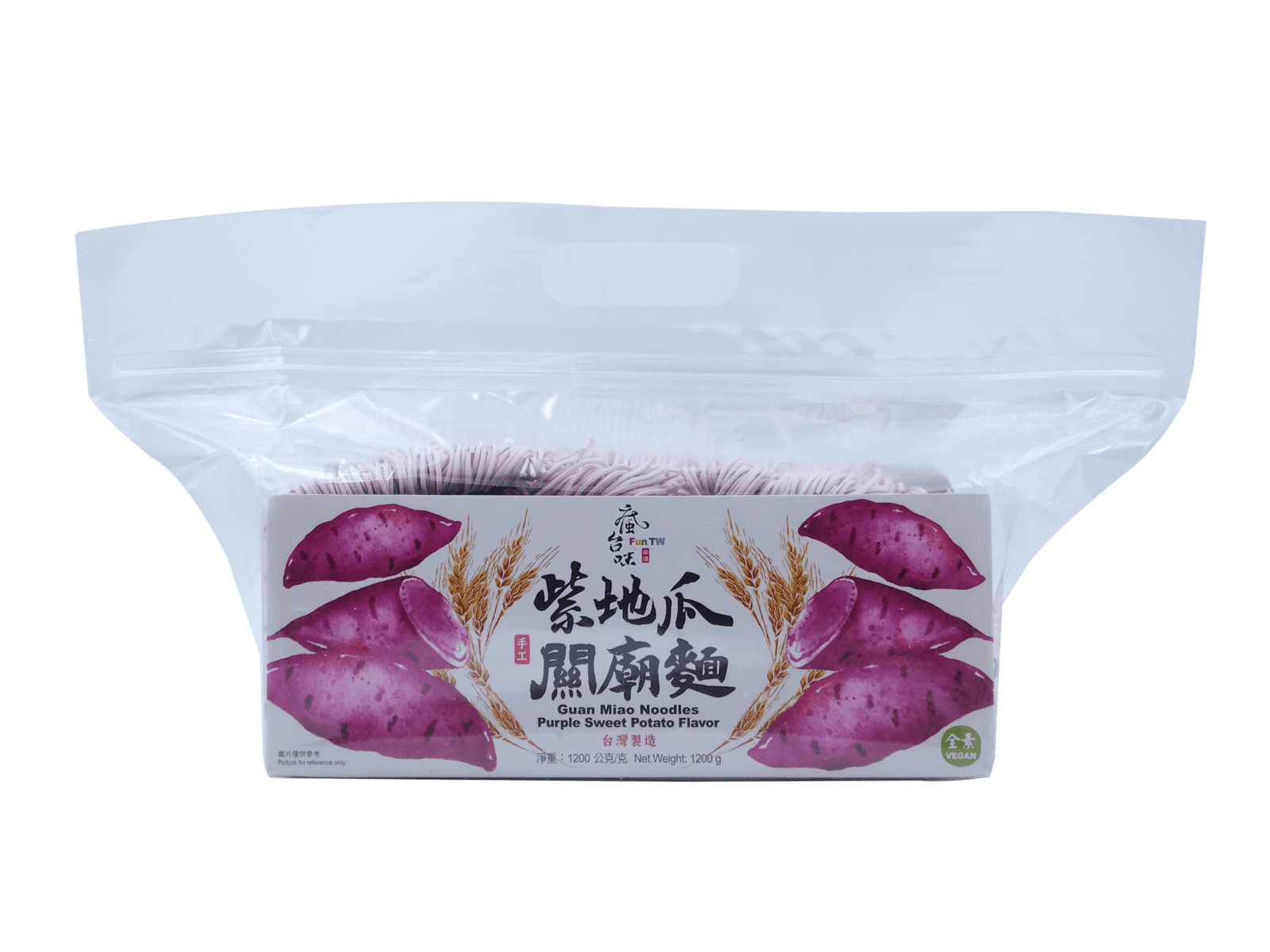 Brand: Feng Tai Wei Description: Sliced Noodle PURPLE SWEET Packaging: 18x400gram Country Origin: Taiwan Net Weight in KG (CU): Barcode (CU): Gross Weight in KG (SU): Amount of SU Per Pallet: Amount of Layers Per Pallet: Pallet: