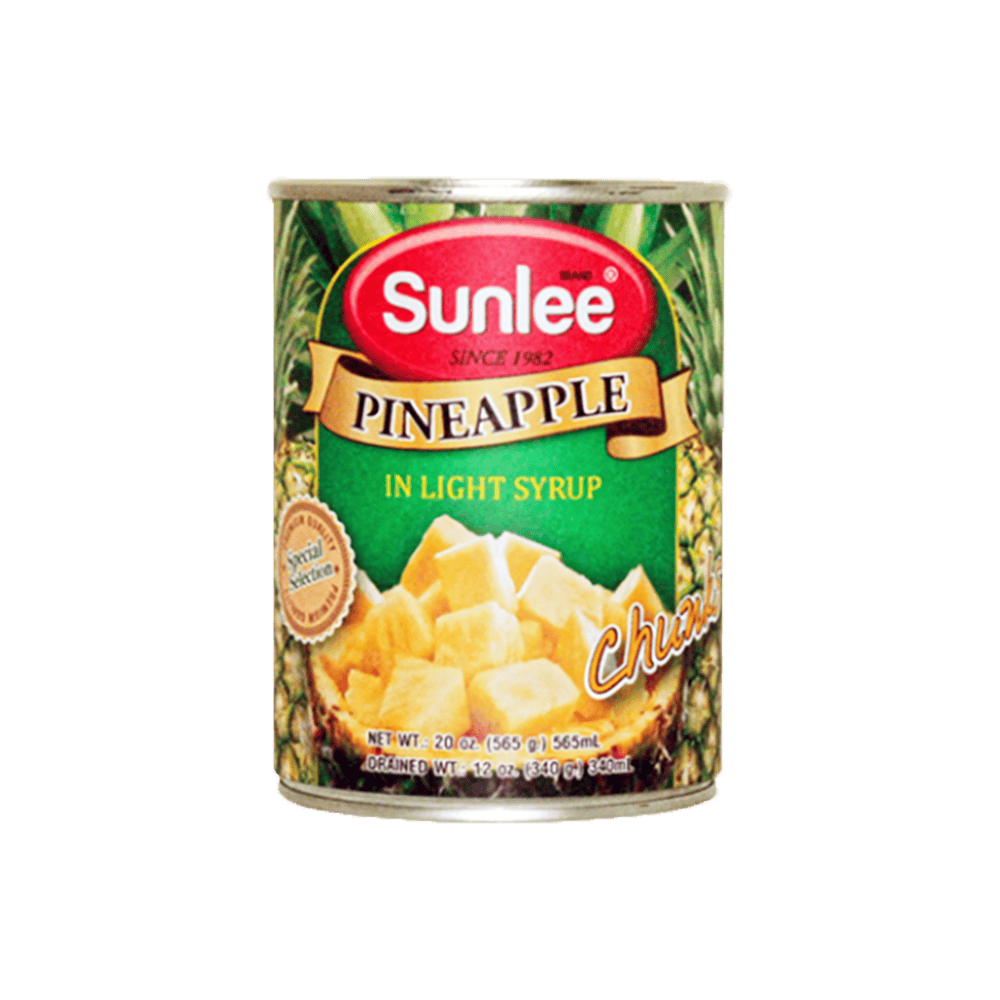 Brand: Sunlee Description: Pineapple Chunks in Light Syrup Packaging: 24x565gram Country Origin: Thailand Net Weight in KG (CU): 565gram Barcode (CU): Gross Weight in KG (SU): Amount of SU Per Pallet: Amount of Layers Per Pallet: Pallet: