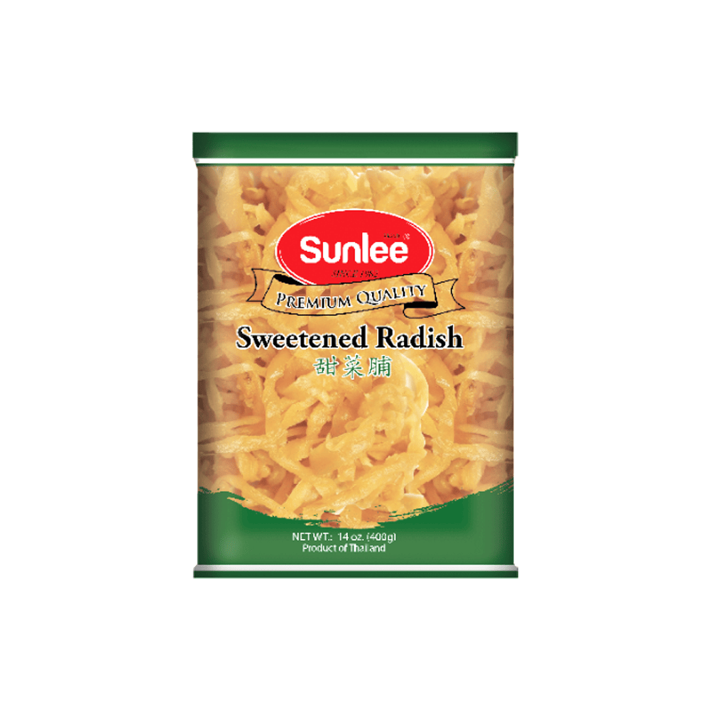 Brand: Sunlee Description: Sweetened Radish Strips Packaging: 25x400gram Country Origin: Thailand Net Weight in KG (CU): 400gram Barcode (CU): Gross Weight in KG (SU): Amount of SU Per Pallet: Amount of Layers Per Pallet: Pallet:
